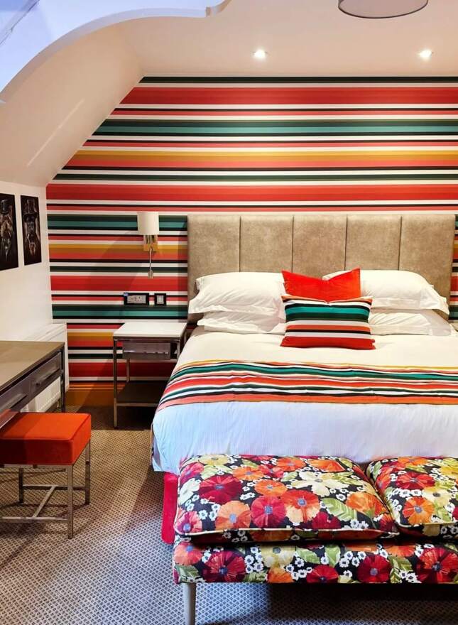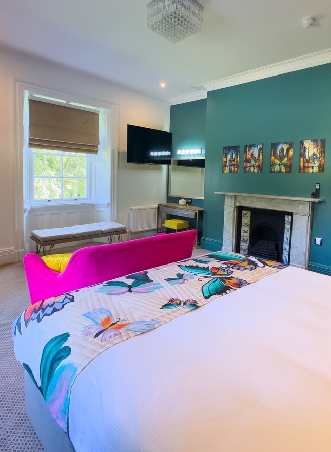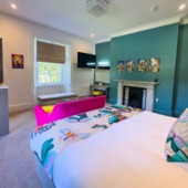 The fifth suite is a haven of relaxation with its king bed and ensuite bathroom, complete with a bath, shower, toilet, and basin. The room offers stunning garden views and a modern, colourful décor that adds a vibrant touch to your stay. Enjoy entertainment on the flat-screen TV with streaming services or relax by the fireplace. The tea and coffee station, desk, and comfortable seating ensure that all your needs are met for a perfect stay.