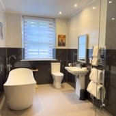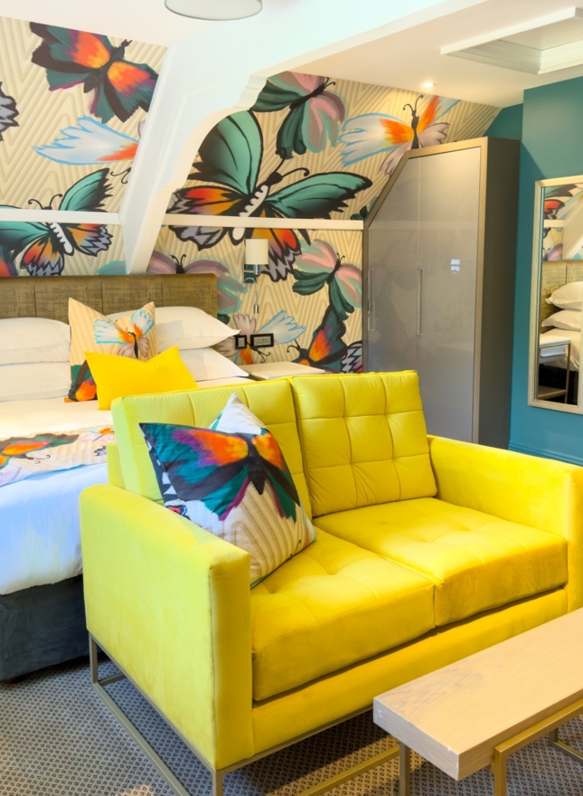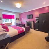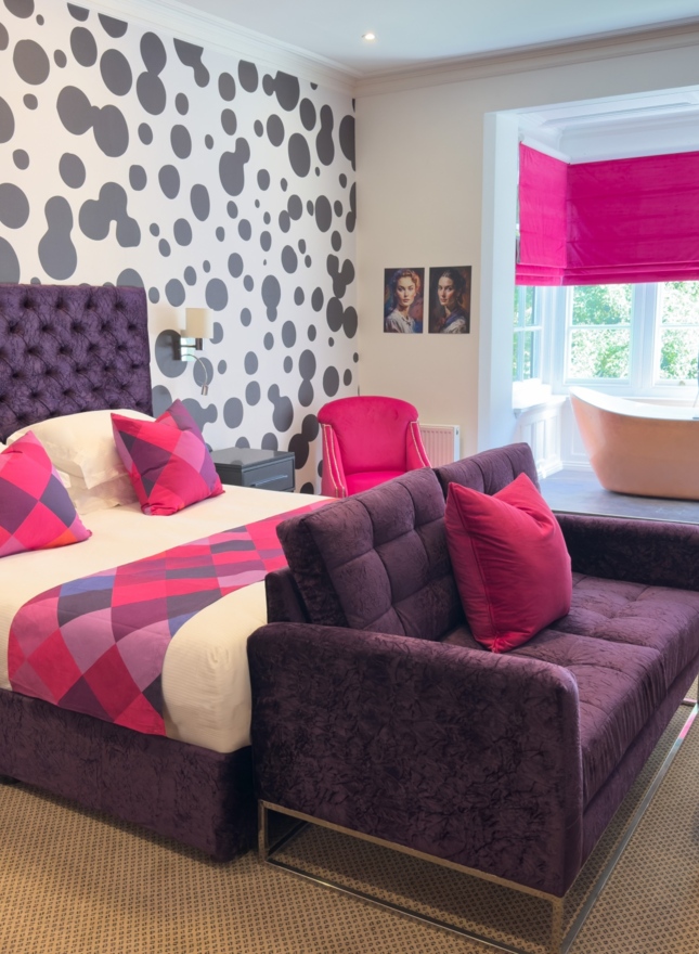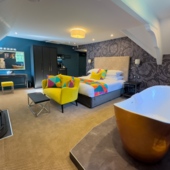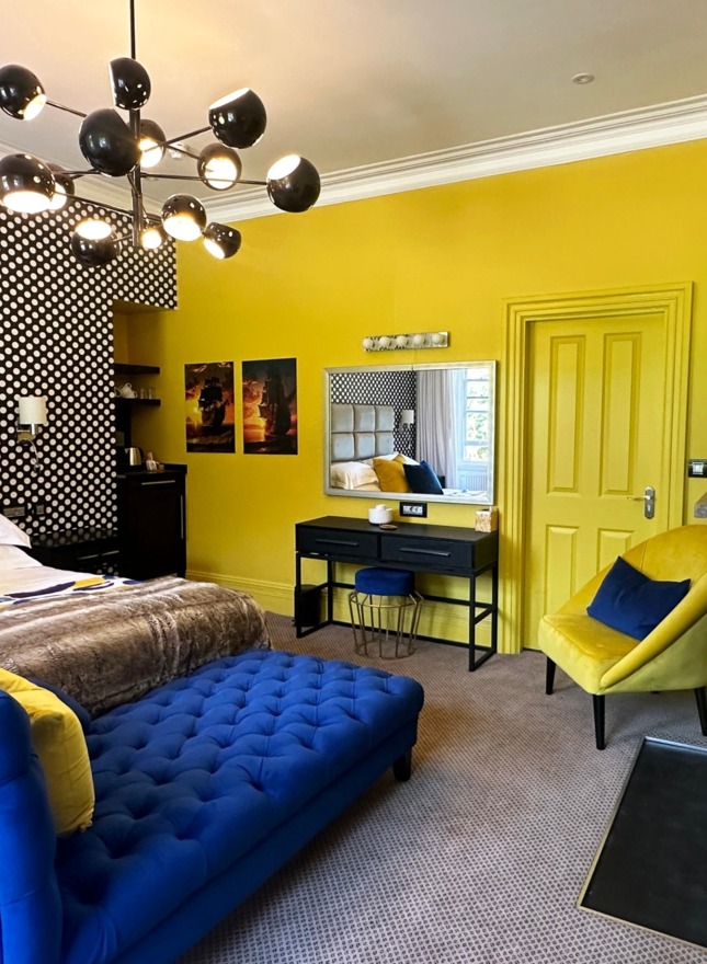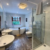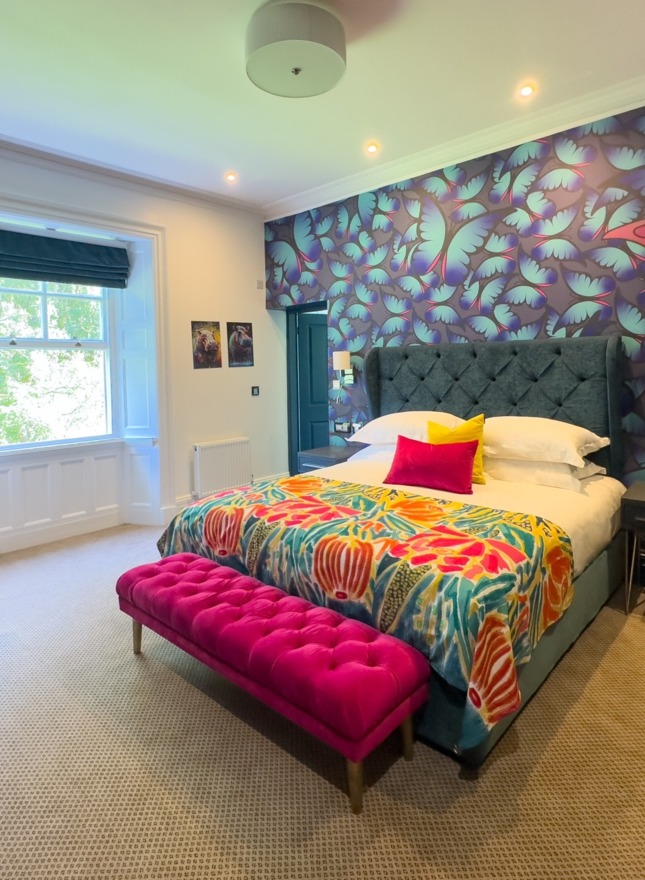 The third suite offers a spacious and stylish sanctuary with a king bed and a luxurious ensuite bathroom that includes a bath, shower, toilet, and basin. The garden views provide a serene backdrop, enhancing the room's modern and colourful décor. Relax with a show on the flat-screen TV, enjoy a warm drink from the tea and coffee station, or get cosy by the fireplace. The comfortable seating and a desk for those who need to stay in touch ensure a delightful stay.