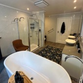 Immerse yourself in the comfort of the fourth suite, featuring a king bed and an ensuite bathroom with a bath, shower, toilet, and basin. The room's modern and colourful décor complements the beautiful garden views. Stay entertained with the flat-screen TV and streaming services or unwind by the fireplace with a cup of tea or coffee. A desk and comfortable seating provide a perfect blend of relaxation and functionality, making this room an ideal choice for your stay.