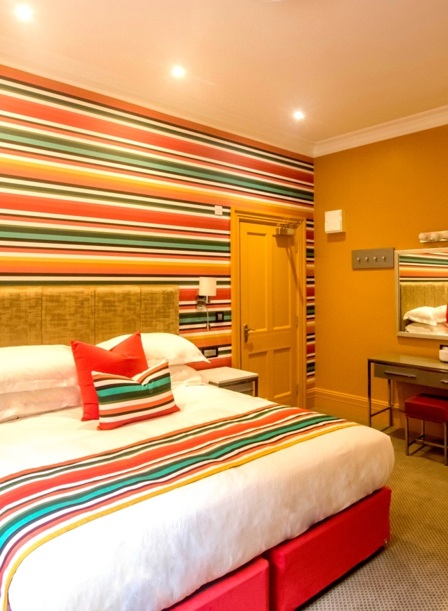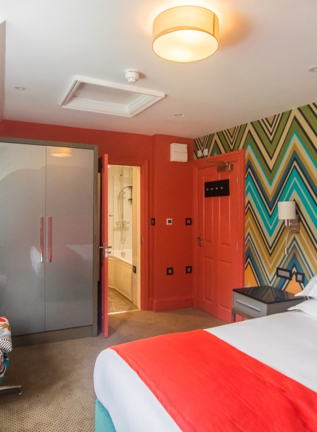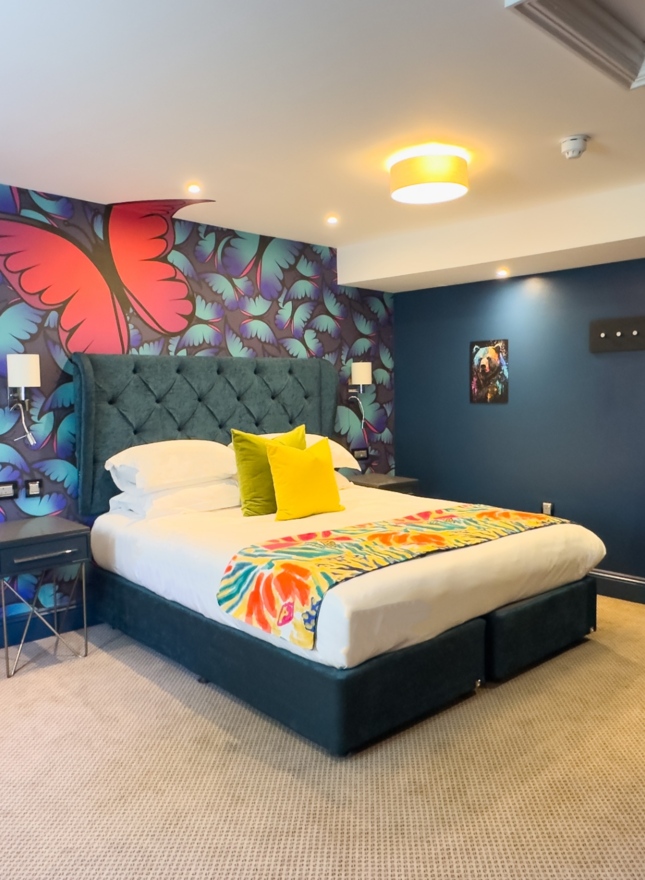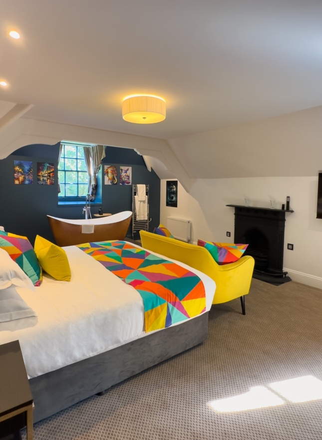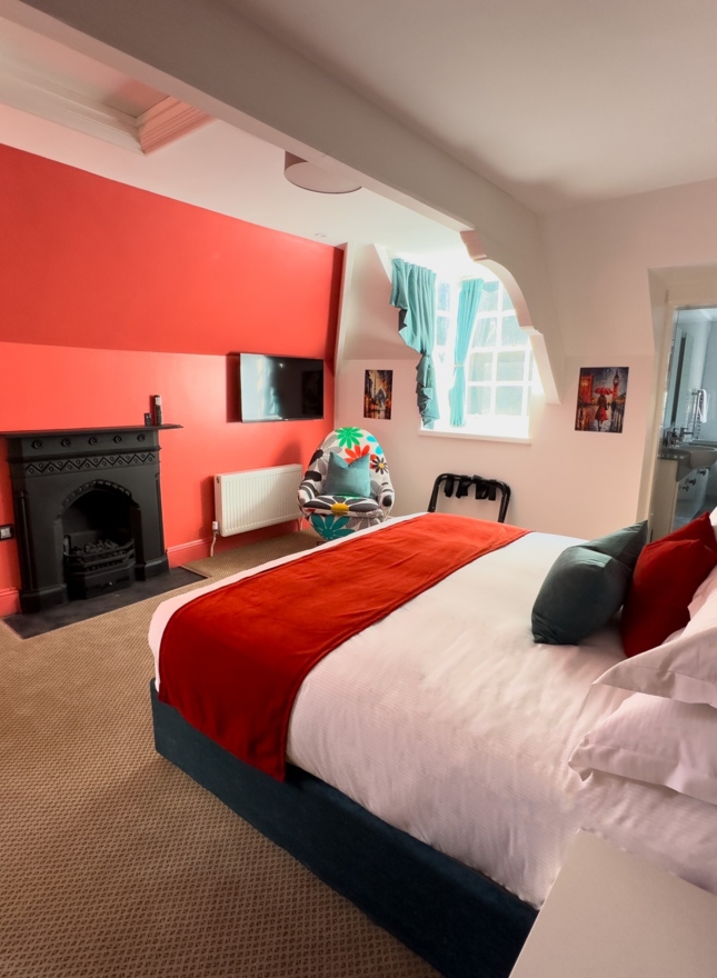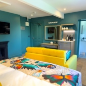 Indulge in the luxury of the sixth suite with its king bed and an ensuite bathroom featuring a bath with an overhead shower, toilet, and basin. The room's garden views and modern, colourful décor create a serene and inviting atmosphere. Relax with the flat-screen TV and access to streaming services, enjoy a hot drink from the tea and coffee station, or warm up by the fireplace. With a desk and cosy seating, this room provides everything you need for a comfortable and enjoyable stay.